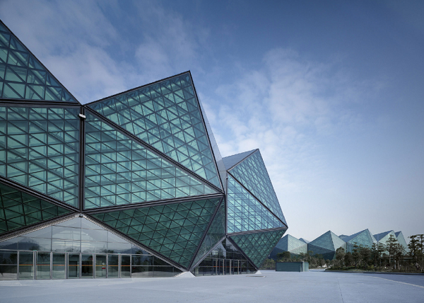 深圳大運(yùn)中心體育館鋼結(jié)構(gòu)屋蓋集高聳結(jié)構(gòu)和大跨度空間結(jié)構(gòu)于一體,由16個(gè)形狀相近的鋼結(jié)構(gòu)單元構(gòu)成,直徑達(dá)158米,工程用鋼量約5800噸。項(xiàng)目外圍護(hù)結(jié)構(gòu)系統(tǒng)(屋面結(jié)構(gòu)系統(tǒng)與立面幕墻系統(tǒng))總面積3.3萬平方米,由三角形鋼架、聚碳酸酯板和鋼化夾膠玻璃共同組成“水晶石”造型,內(nèi)層采用玻璃纖維張拉膜。其中屋面結(jié)構(gòu)系統(tǒng)由224根三角形鋼架做骨架、7776塊9393平方米的聚碳酸酯板(PC板)、10358塊17471平方米的XIR膜夾膠鋼化玻璃、6439平方米的“W”形鋁板天溝和624個(gè)自然通風(fēng)及48個(gè)機(jī)械通風(fēng)百葉組成。立面幕墻系統(tǒng)由144根鋼立柱組成受力支撐骨架,由2727平方米的中空LOW-E鋼化玻璃和64檔平開門組成。