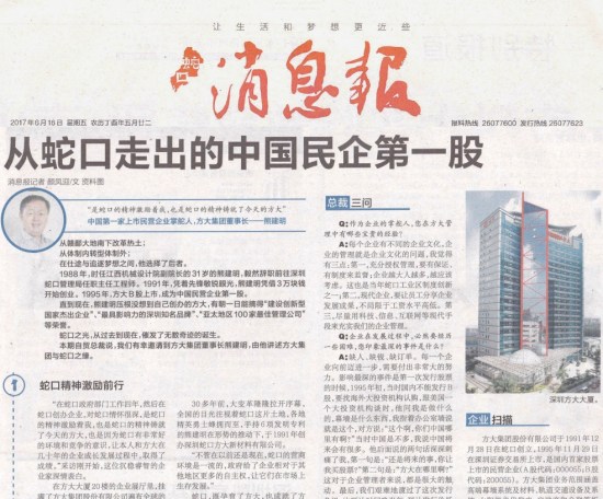 6月16日,《蛇口消息報》刊登題為“從蛇口走出的中國民企第一股”專訪文章,重點報道國內(nèi)首家上市民營企業(yè)——方大集團股份有限公司作為蛇口精神的傳承者,成立26年來始終秉承“科技為本,創(chuàng)新為源”的經(jīng)營理念,不忘初心,砥礪前行,在節(jié)能環(huán)保領域不斷取得令人矚目的成就。當前,方大集團正積極參與“一帶一路”國際合作和“粵港澳大灣區(qū)”建設,大力拓展海外市場,努力將方大高端幕墻系統(tǒng)、方大軌道交通站臺屏蔽門等創(chuàng)新成果推向全世界。