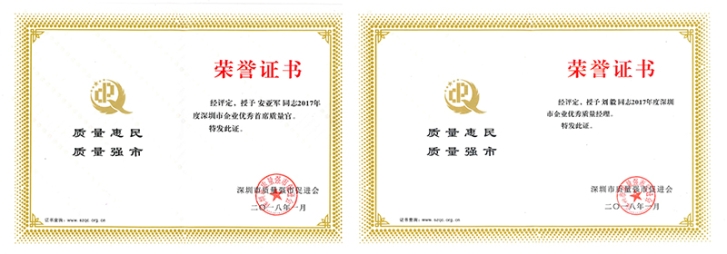 2017年度“深圳市企業(yè)優(yōu)秀首席質(zhì)量官”、2017年度“深圳市企業(yè)優(yōu)秀質(zhì)量經(jīng)理”榮譽稱號由深圳市質(zhì)量強市促進會組織評選,旨在培養(yǎng)支撐企業(yè)首席質(zhì)量官制度落實的關(guān)建人才隊伍,弘揚企業(yè)質(zhì)量文化,引領(lǐng)和推動所在行業(yè)質(zhì)量進步。