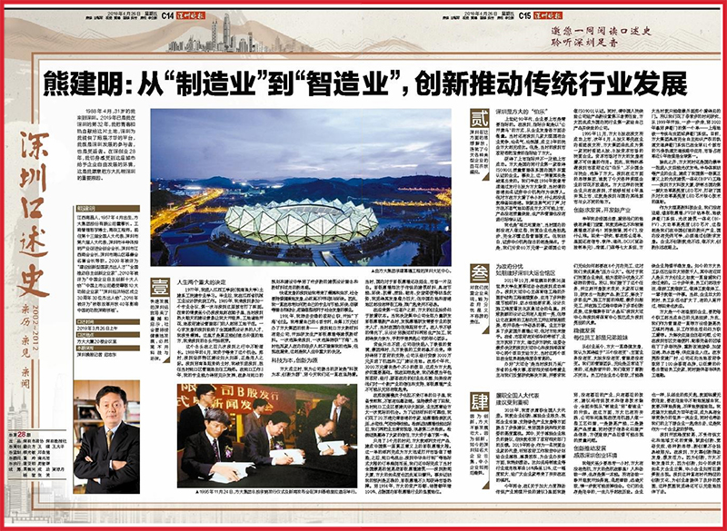 4月26日,深圳晚報刊發熊建明董事長專訪報道《熊建明:從“制造業”到“智造業”,創新推動傳統行業發展》