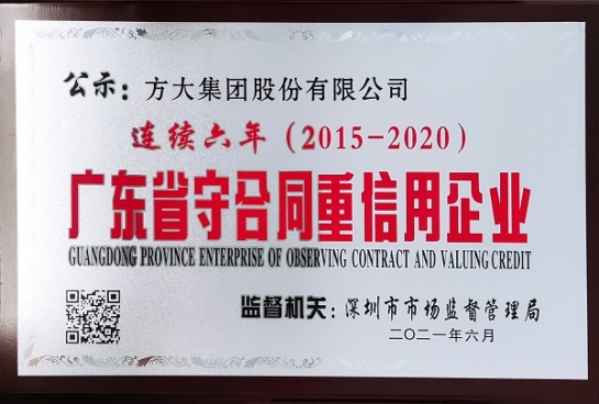 方大集團成立以來,堅持強化合同守信意識和品牌意識,從嚴把關、達誠申信。公司連續6年獲得“廣東省守合同重信用企業”榮譽稱號,是市場監管部門和社會各界對公司長期以來誠信履約、信義為本的經營態度的高度認可。公司將繼續強化企業信用管理體系,誠信履行合同,提高市場競爭力,為構建更加規范和諧的市場經濟環境做出積極貢獻。